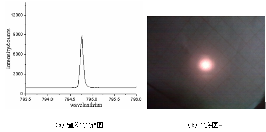 電子所是在國(guó)內(nèi)率先開(kāi)展DPAL研究工作的單位之一,2012年5月,電子所實(shí)現(xiàn)了半導(dǎo)體泵浦線偏振基模銣激光輸出,經(jīng)繼續(xù)對(duì)實(shí)驗(yàn)進(jìn)行改進(jìn),獲得了最高2.8W的銣激光輸出,光光轉(zhuǎn)換效率達(dá)21%。實(shí)驗(yàn)光路如圖2-7所示,實(shí)驗(yàn)測(cè)量的銣激光光譜以及光斑如圖2-8所示。