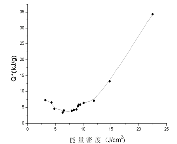 如圖3-5所示,單位面積除漆質(zhì)量先是隨著能量密度上升,在能量密度為6~8 J/cm2之間達(dá)到峰值,隨后下降。當(dāng)激光能量密度大于12 J/cm2后,單位面積除漆質(zhì)量顯著下降,此時(shí),激光與樣品表面的作用機(jī)理可能已發(fā)生突變。而進(jìn)一步分析Q*值(Q*=激光能量密度/單位面積除漆質(zhì)量)隨能量密度的變化曲線,如圖3-6所示。可以看出,當(dāng)能量密度大于10 J/cm2后,Q*值隨著激光能量密度的提高大幅提高,說(shuō)明激光能量的利用效率顯著下降。且在入射激光能量密度為6.5 J/cm2時(shí),Q*值為極小值,約為3 kJ/g。