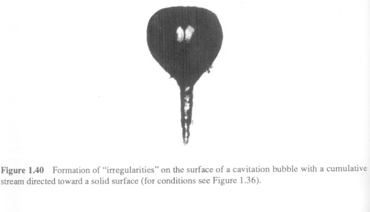 當(dāng)氣泡靠近容器壁時(shí),氣泡的形狀會(huì)持續(xù)變化,變到后來(lái)長(zhǎng)出一個(gè)尾巴,像錐子一樣,錐子尖指向容器壁。這是氣泡典型的形狀,如圖3所示。通常人們會(huì)認(rèn)為氣泡是一個(gè)球,但現(xiàn)在看來(lái)并非如此。首先,這個(gè)錐形是非常尖的;第二,它是非常有力的,呈向外噴射狀。它碰到固體的邊時(shí),會(huì)打擊出一個(gè)小窟窿、一個(gè)麻點(diǎn),所以超聲波作用時(shí)間長(zhǎng)了以后,固體的邊和拋光的面就會(huì)變毛。正因?yàn)檫@個(gè)力量是非常大的,作為超聲清洗的機(jī)理之一,即超聲波可以清洗骯臟的油、污漬等等。它的條件是一定要靠近固體邊,就是氣泡和固體邊相互作用。所以通過(guò)這兩張圖,我們能看出來(lái),空化氣泡里面研究的學(xué)問(wèn)是很深的。