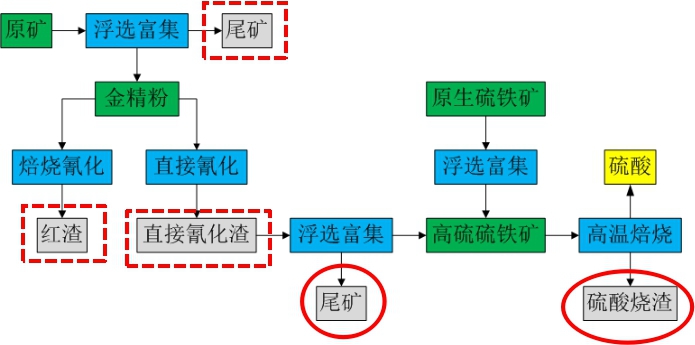 黃金生產(chǎn)過程的固廢包括浮選尾礦、氰化渣(紅渣和直接氰化渣)(圖3)??蓪?duì)金精礦的浮選尾礦進(jìn)行氰化提金或制造建材,對(duì)直接氰化渣進(jìn)行浮選回收有價(jià)元素。