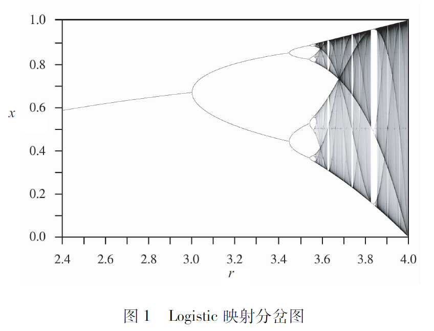 那混沌又是什么呢?混沌就是動力學(xué)系統(tǒng)在某些參數(shù)下產(chǎn)生的一種現(xiàn)象,以Logistic映射為例,當(dāng)r>3.57時會發(fā)生混沌行為。那混沌行為有什么特點呢?簡單來說,在混沌狀態(tài)下你會發(fā)現(xiàn)映射隨時間演化的結(jié)果并不呈現(xiàn)某種周期性,同時還會發(fā)現(xiàn)映射演化的結(jié)果對初值極其敏感。也就是說從不同的初值x0出發(fā),演化很長時間后,例如100萬步后,會觀察到它們的演化結(jié)果是完全不一樣的,這就叫作對初值的敏感性。另外要說明的是,Logistic映射很簡單,是一個確定性的動力系統(tǒng),但是它產(chǎn)生的混沌行為是非周期的,就像隨機(jī)結(jié)果一樣。這就很奇怪了,因為一個不包含隨機(jī)因素的確定性動力系統(tǒng),當(dāng)它處于混沌狀態(tài)時它看起來就像是