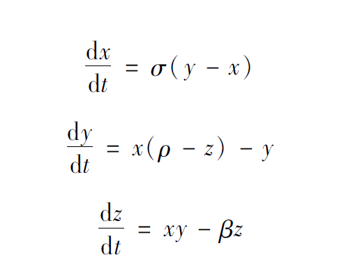剛才講的Logistic映射是一個離散動力系統(tǒng),下面給出一個連續(xù)動力系統(tǒng)的例子,該系統(tǒng)非常有名,叫作洛倫茲系統(tǒng),是1969年洛倫茲在研究氣象模型時提出的: