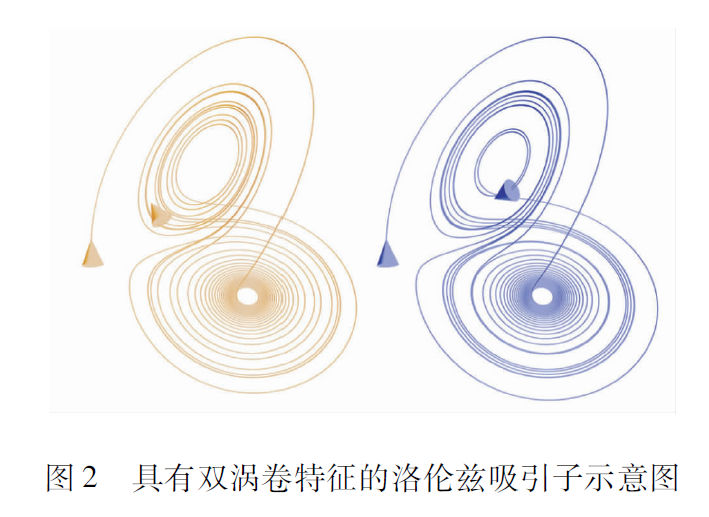 洛倫茲系統(tǒng)其實就是一個簡單的三維自治ODE方程組,洛倫茲發(fā)現(xiàn)在某些參數(shù)下該系統(tǒng)會出現(xiàn)混沌行為。圖2給出了洛倫茲系統(tǒng)具有雙渦卷特征的混沌吸引子相圖,注意其軌道是永不重復(fù)的。
