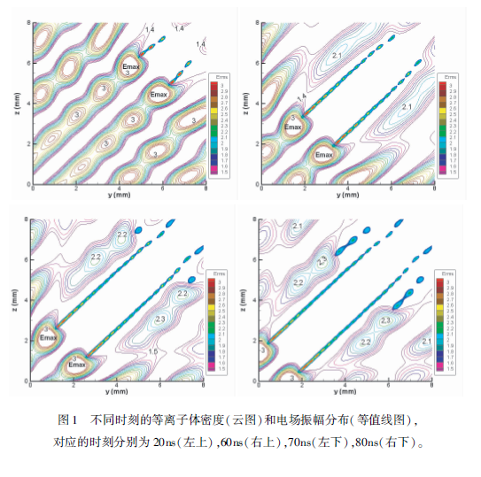 下面看一下相交微波束大氣擊穿的模擬結(jié)果,我們首先算了同頻率微波相交的情況,此時相干疊加之后,由于干涉作用,會形成電場強(qiáng)度強(qiáng)弱分布。我們首先模擬一下種子電子在弱場區(qū)的情況。因為在大氣中種子電子是偶然出現(xiàn)的,有可能出現(xiàn)弱場區(qū),如果出現(xiàn)在弱場區(qū),它需要擴(kuò)散,擴(kuò)散到強(qiáng)場區(qū)之后電子碰撞分子發(fā)生雪崩電離,形成的等離子體沿著強(qiáng)場區(qū)做趨源運動,運動方向沿著)=:的這條線。形成的等離子體的區(qū)域是一個等離子體絲帶,當(dāng)然如果把氣壓降低,會發(fā)現(xiàn)絲帶就會過渡為一個等離子體帶。圖1給了幾個典型時刻的等離子體密度分布和場強(qiáng)的分布,在20ns的時候,由于靠近等離子體區(qū)域最強(qiáng)的場是沿著)=:這條線的,當(dāng)?shù)入x子體絲帶長度增加到一定程度的時候,在其左上和右下區(qū)域,相當(dāng)于把兩個微波場隔開,這兩個區(qū)域相當(dāng)于只有一個單微波的作用,在兩邊有新的等離子體絲帶。如果初始電子出現(xiàn)在強(qiáng)場區(qū),電子碰撞分子就會雪崩電離,形成等離子體。等離子體區(qū)域也是沿著J=:這條線做趨源運動。下面簡單比較了同頻和非同頻微波相交的大氣擊穿,同頻相當(dāng)于相干疊加,非同頻相當(dāng)于非相干疊加,模擬時間都是80ns,初始的種子電子數(shù)都一樣,可以發(fā)現(xiàn)在相干的情況下,即使把種子電子源放到場強(qiáng)最小的地方,產(chǎn)生等離子體的區(qū)域也大于非相干的情況,而且產(chǎn)生的最大電子數(shù)也是大于非相干的情況。總結(jié)主要有三點,一個是區(qū)域隨壓強(qiáng)的變化,還有等離子體做趨源運動,還有相干比非相干的等離子體區(qū)域比較大。