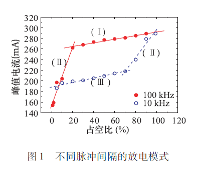 如果兩個脈沖間隔比較近,那么跟連續(xù)就沒什么差異,因為脈沖撤銷以后,即射頻消失以后,電極間還存在的空間電荷,也就是有電子和離子分離存在,這些電子在第二脈沖上來后就會參與放電,這時與連續(xù)放電差異性就不大了。如果脈沖間隔范圍足夠?qū)?,這就成為兩個不同的放電,兩個放電之間是不相關(guān)的。如圖1( I)是脈沖之間間隔非常小的時候,稱為連續(xù)模式;下面的Ⅲ是脈沖之間間隔非常大的時候,稱為分離模式,我們可以看到整個放電的峰值電流要小不少。在它們之間,(II)稱為傳輸模式,在兩個脈沖之間,電子沒有完全消亡的情況下放電電流與占空比的關(guān)系。共有上述三個過程,可見脈沖的間隔長短對放電的影響不是由占空比決定,主要是考慮電極之間間距和里面所參與的空間電荷分布變化。