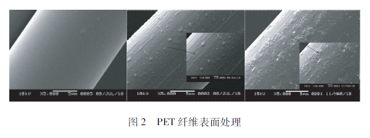 用長50cm、間距5cm的電極板做了一個射頻的放電模式。我們用上面介紹的JET做了滅菌實驗,細(xì)菌的存活數(shù)量得到了有效的下降。在這里主要看一下對化纖的處理效果,圖2的左圖是沒有處理過的,中圖是200 W處理的,右圖是800 W處理的。這兩個之間有什么區(qū)別呢?中圖顯示纖維表面有溝槽出來,這任何化纖在等離子體處理情況下刻蝕的一個特征,在低真空情況下的射頻放電都會有溝槽刻蝕出來。但是在大氣壓輝光放電的情況下,表面有許多圓形體產(chǎn)生。我認(rèn)為不單純有刻蝕,而且有表面熔融的狀態(tài)出來。所以說,在大氣壓射頻放電對表面的作用是相當(dāng)強(qiáng)的。雖然每個脈沖時間比較短,但是它的作用非常強(qiáng)。